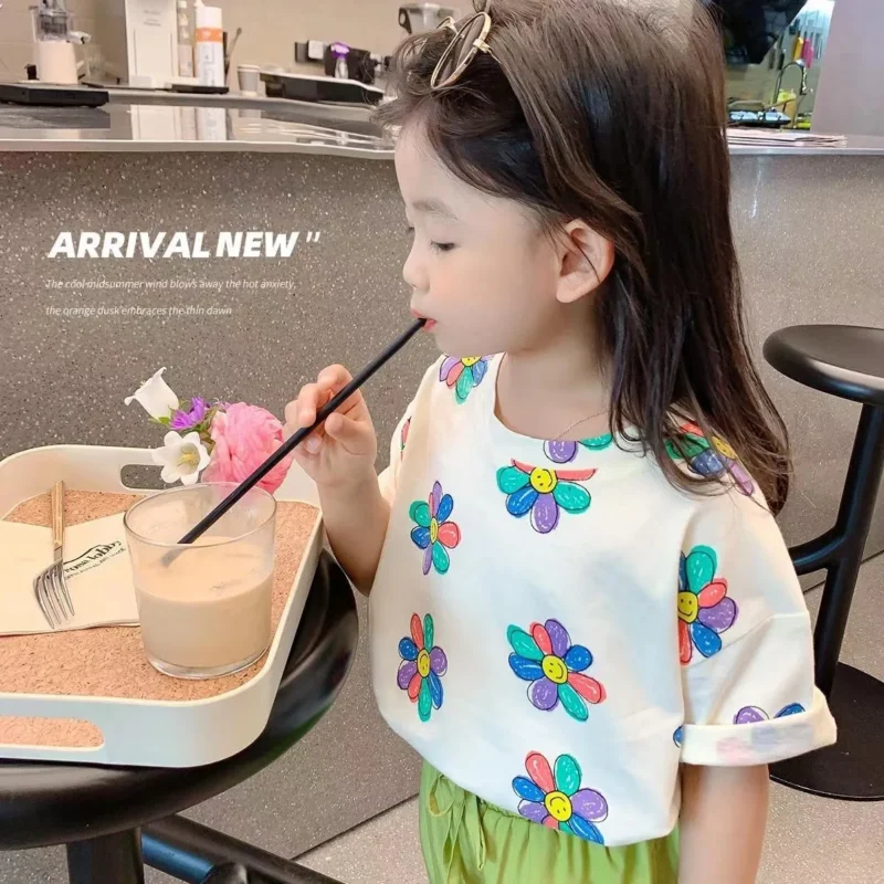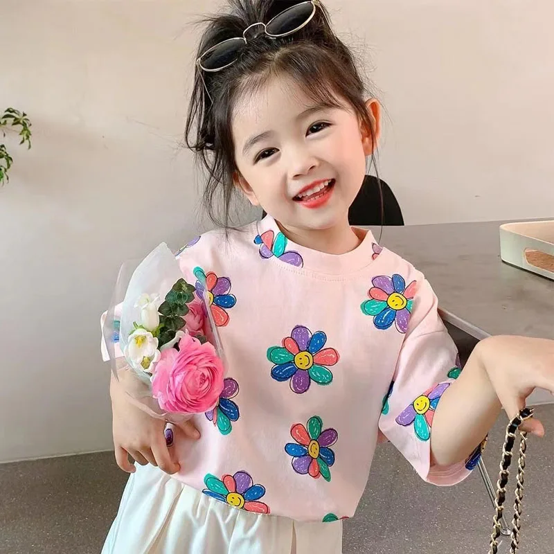 1pcs Summer Kids Flower Print Tops Clothes Girls Korean Style Shirt Children Short Sleeve T-shirts Child Casual Comfort T Shirs