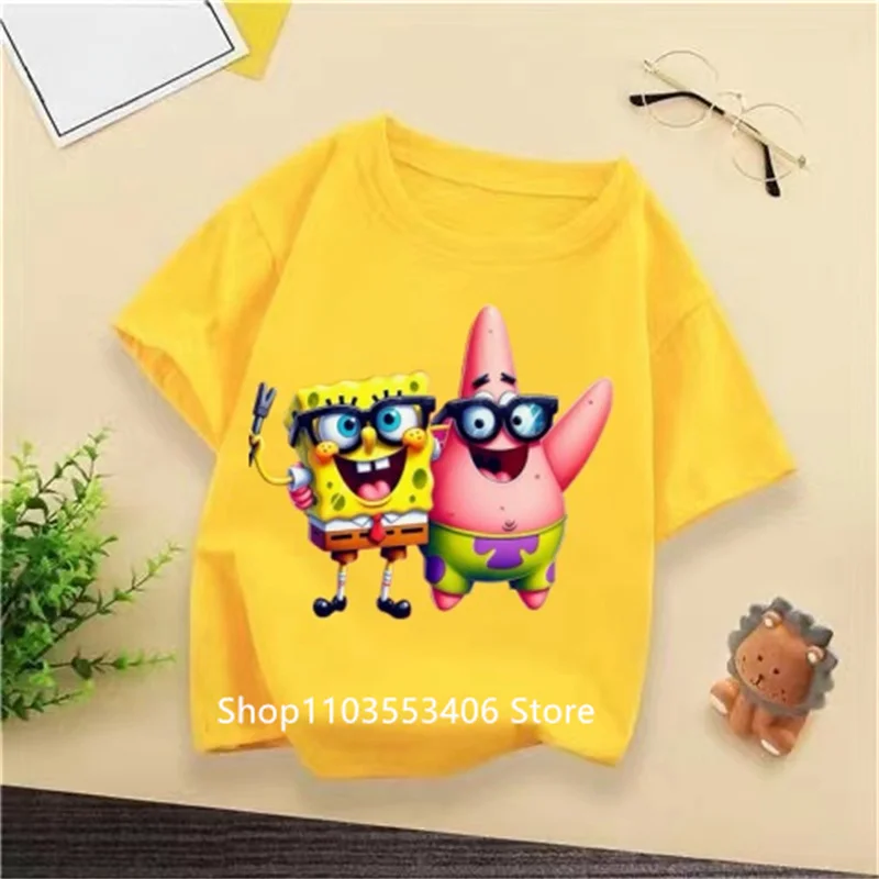 2024 New SpongeBob Summer T-shirt for Kids Boys and Girls Short Sleeve Cartoon Print Kids T-shirt