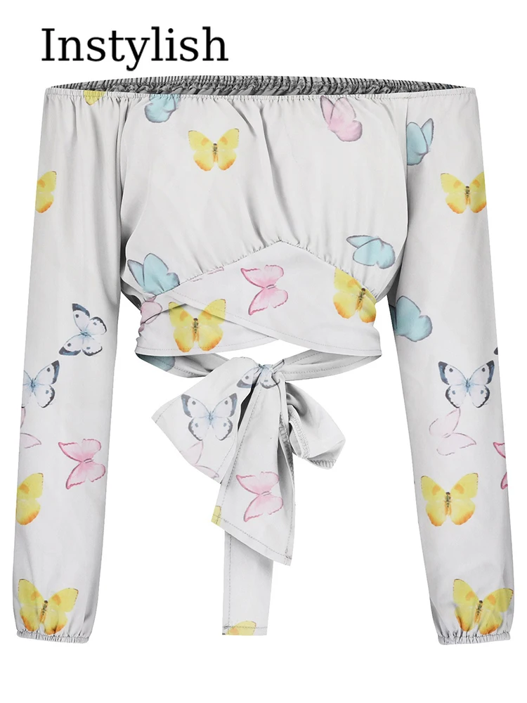 Home Women Women Sexy Off Shoulder Printing Blouses Chic and Elegant Lantern Long Sleeve Lace Up Bow Cropped Tops Casual Slim Shirts 2023